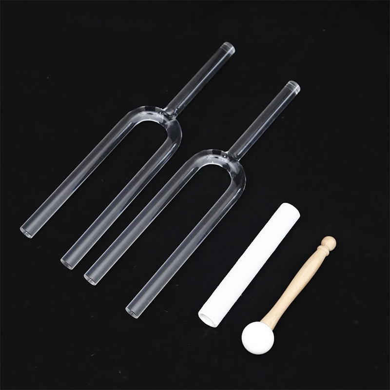 Déantar na gabhlóga tiúnála Crystal againn a mhonarú ó chriostail íon Grianchloch 99.99%, agus is iad na forcanna tiúnta amhránaíochta criostail is fearr agus is fearr. Déantar an Grianchloch brúite a théamh go dtí 1800 céim ar a laghad sa phróiseas déantúsaíochta. Ansin, déantar tástáil orthu chun an nóta ceoil a chinneadh. Cé go bhfuil ton ochtave níos doimhne agus níos ísle ag na forcanna níos mó, ní hé an méid a chinneann 'nóta' na bhforcanna. Tá baint ag na forcanna leis an scála ceoil, ag tosú le C, ansin D, E, F, G, A, agus B. Tá baint ag na nótaí seo ar a seal le Seacht Chakras an Chórais Daonna.